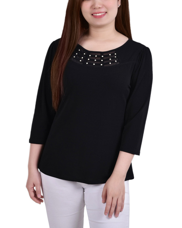 NY Collection Womens 3/4 Sleeve Crepe Knit Strip Detail Top