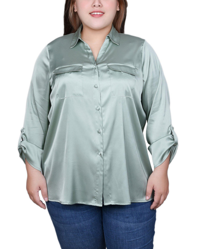 NY Collection Plus 3/4 Sleeve Roll Tab Satin Blouse