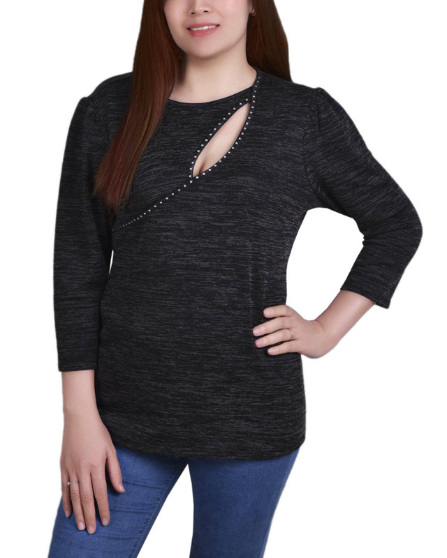 Perfect for day or night, NY Collection presents a play on a basic top with a geometric cut and studs. Fabrication-Hacci Knit. Care Instruction-Machine Wash.