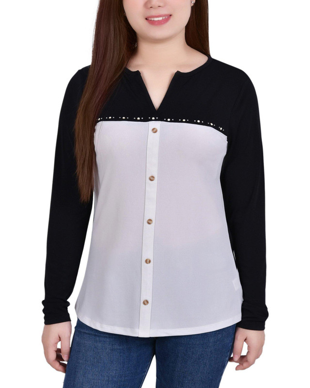 Dress it up or down, this studded neck knit crepe top from NY Collection can be paired with jeans or dressed up with your favorite dress pants or skirt.