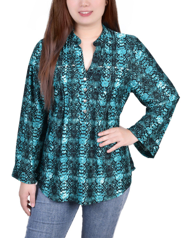 NY Collection Womens Long Sleeve Jacquard Knit Y Neck Top