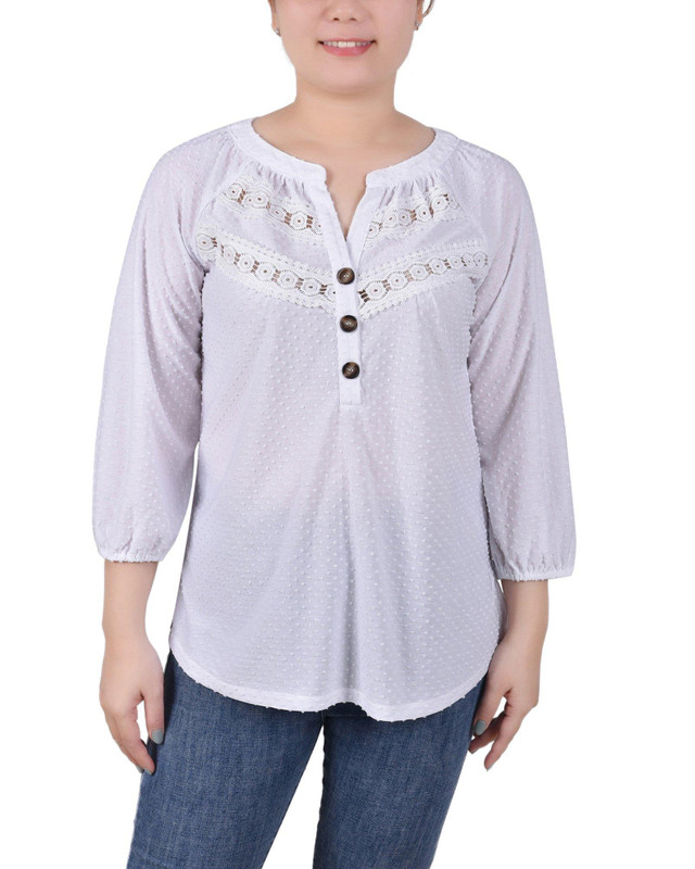 This Petite knitted swiss dot top from NY Collection has it all. The crochet inset brings a nice neckline detail. The raglan sleeves and elastic cuff are so flattering on every body.