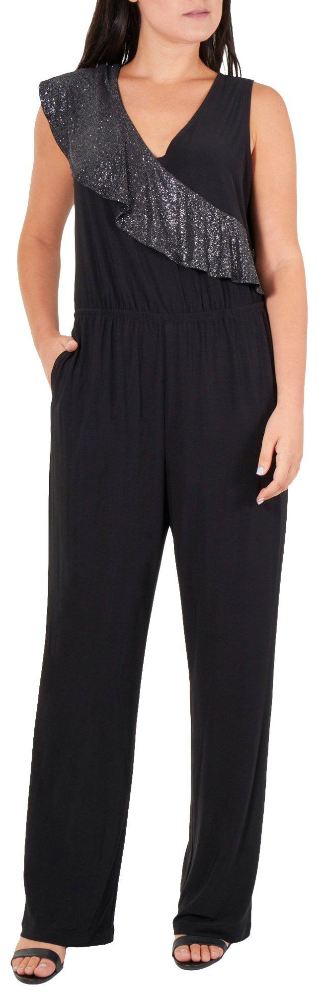 NY Collection brings a comfortable and stylish look to your wardrobe. A glitter ruffle cascades down the neckline of this sleeveless jumpsuit giving your outfit a touch of glam perfect for the upcoming holiday party season. Inseam measures approximately 30``.