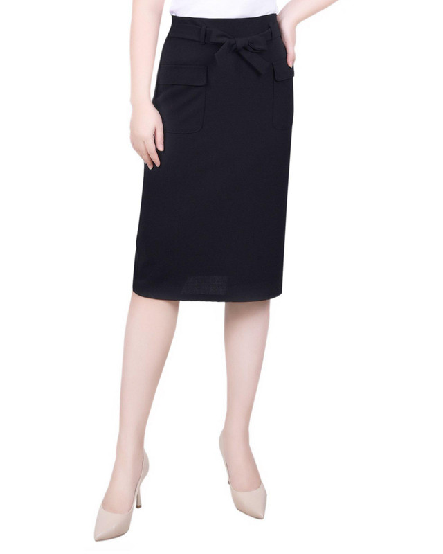 NY Collection presents this slim scuba crepe skirt with a self belt and front patch pockets with flaps. Offered in several colors to satisfy your every mood.