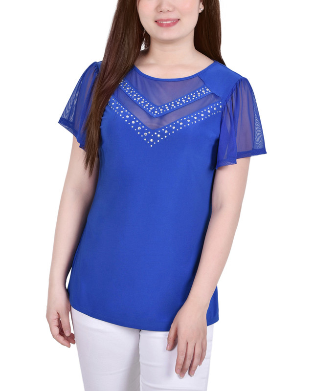 NY Collection Womens Studded Flutter Sleeve Mesh Detail Top