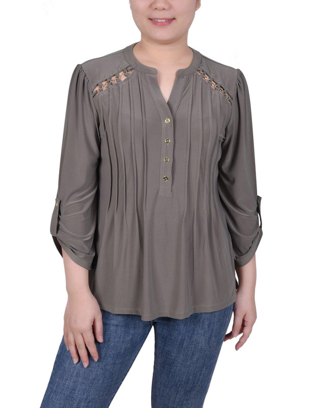 It's all about the details on this Petite jersey knit top from NY Collection. The front shoulders feature cutouts with a chain detail. There are pintucks down the front bodice Mandarin Y Neck. There are roll tab sleeves to make this blouse a year-round choice.