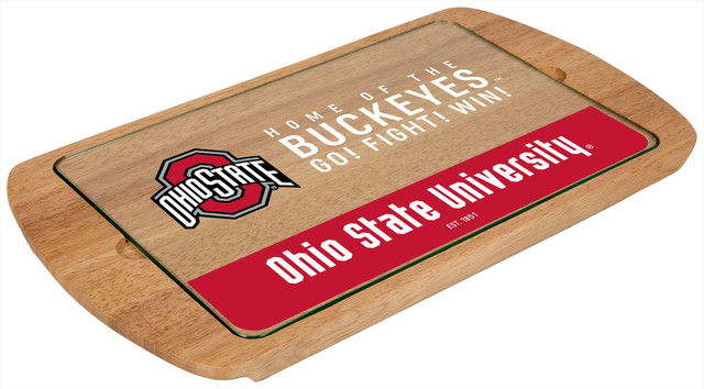 Billboard Glass Top Serving Tray is a rubberwood cutting board with a removable and customizable glass plate top that features Ohio State Logo. Glass is tempered and measures: 14 x 9.875 x .2 inches. Rubberwood base measures 17.5 x 9.75 x 7.55 inches.