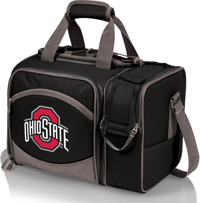 The Malibu Picnic Tote includes two 9'' melamine plates, two 8 oz. wine glasses, four 14'' cotton napkins, two stainless steel forks, knives, and spoons each, one 6''L x 6''W cutting board, one stainless steel cheese knife, and one stainless steel corkscrew. Measures 15''L x 9''W x 11''H.