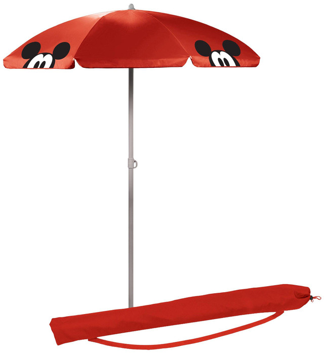 This umbrella is perfect for the beach, tailgating, or picnics. The pole measures 81.5'' tall and 1.3'' diameter with a tilting option as well as pointed end for easier penetration into the ground. Umbrella measures 5.5' across and features Mickey Mouse design. Sturdy drawstring bag with strap included.