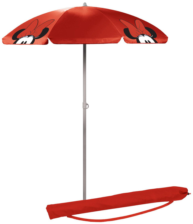 This umbrella is perfect for the beach, tailgating, or picnics. The pole measures 81.5'' tall and 1.3'' diameter with a tilting option as well as pointed end for easier penetration into the ground. Umbrella measures 5.5' across and features Minnie Mouse design. Sturdy drawstring bag with strap included.