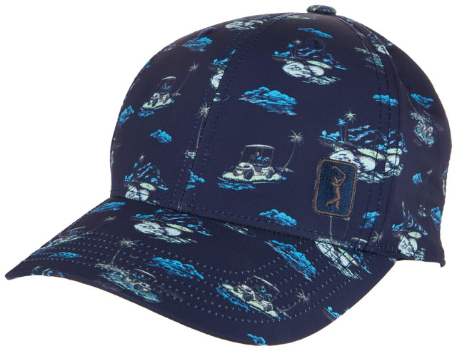 This Mens Hat features a print pattern on lightweight woven fabric, a pre-curved bill, moisture wicking technology, and an adjustable snapback closure in back. Wipe clean only. One size fits most.