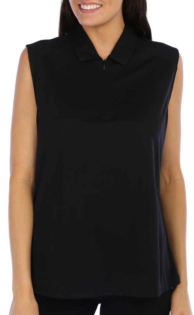 This sleeveless polo features a solid color design on lightweight Airflux ventilated stretch knit fabric, a split neckline with zip placket, a spread collar, moisture-wicking technology to keep you feeling cool and dry, and UPF 50 sun protection. The top length measures approximately 24 in.