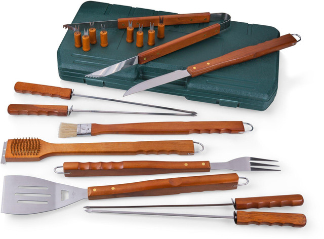 This 18-piece BBQ Tool Set features extra long wood and stainless steel handles with loops at the ends of their handles. Includes plastic case, a spatula, tongs, fork, knife, basting brush, 4 skewers, 8 corncob holders, and a grill brush with scraper. Measures 23'' x 12'' x 3''.