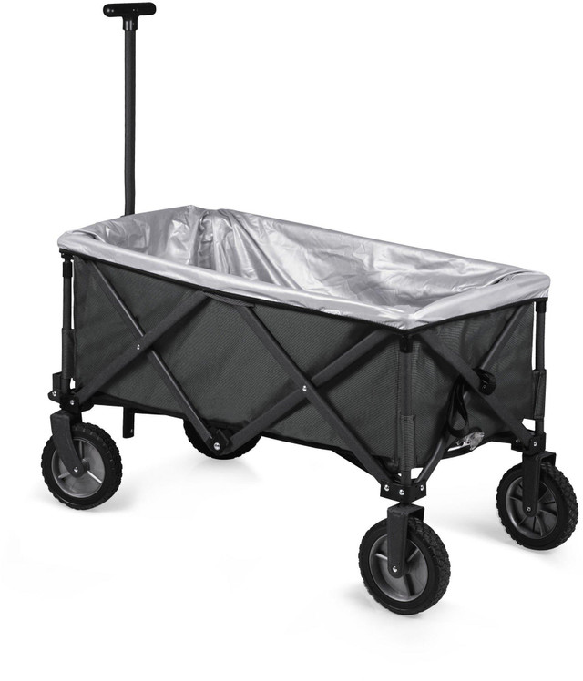 The Adventure Wagon features heavy-duty wheels, telescopic handle, waterproof liner, table top lid, and fitted cover. Made of 600D polyester with a powder coated steel frame. Measures: 35.6'' x 18.9'' x 21.9'' open, 10'' x 11'' x 30'' closed. Perfect for tailgating at your favorate sporting event: NCAA, NFL, MLB. Great for the beach and outing with the kids.