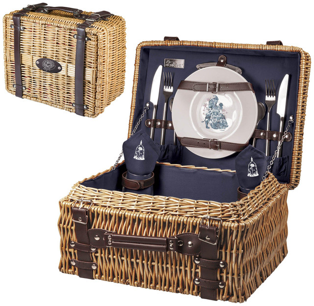 The Champion picnic basket features service for two, including two 7 oz. wine glasses, two porcelain plates, stainless steel flatware, and two napkins. Basket is made of willow and features wrapping closure straps, overlapping lid, and sturdy handle. Measures 16''L x 12''W x 8''H.