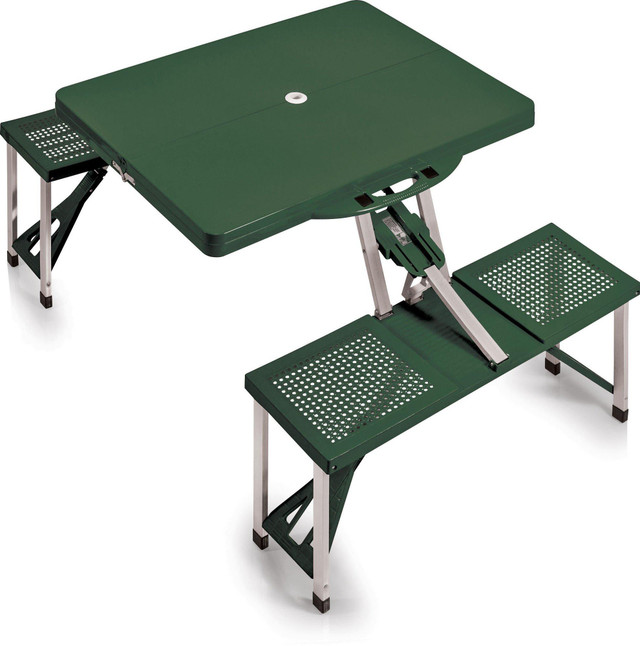 This picnic table is a compact fold-out table with legs and seats that fold into the table when collapsed. Maximum weight capacity of 250 lbs. per seat and 20 lbs. for the table. Compatible with standard sized beach umbrellas. Measures 34'' x 4.25'' x 15.5'', and weighs 24 lbs. Great for tailgating at your favorate sporting event, NCAA, NFL, MLB.