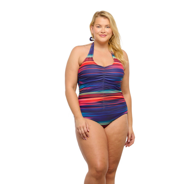 Introducing our vibrant one-piece swimsuit, featuring a multi-striped design and halter styling with an adjustable neck tie. The front ruching detail enhances the flattering silhouette, making it perfect for sporty and active days. Ideal for the beach, pool, or resort, this fun and colorful swimsuit is a must-have for fashion-forward individuals. Embrace a blend of style and comfort with this eye-catching swimwear piece.