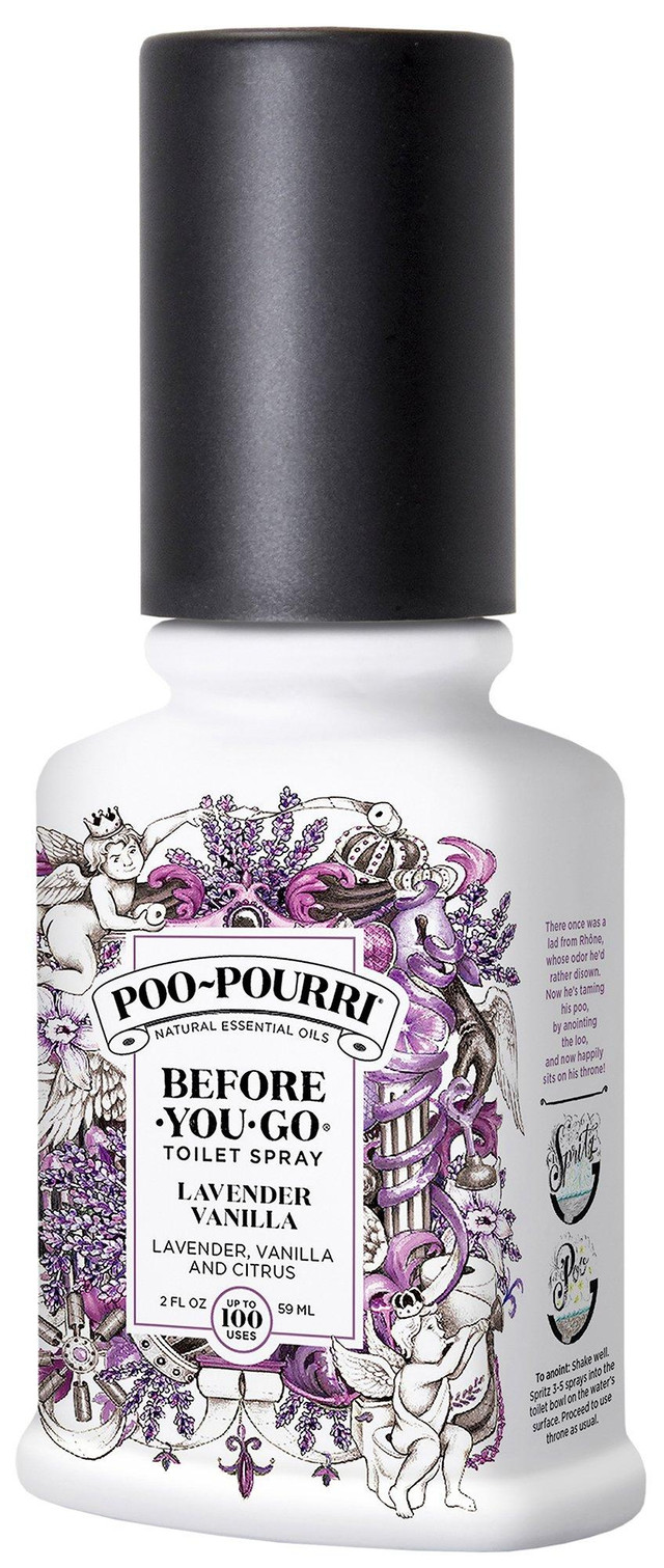 Poo-Pourri Before You Go toilet spray in a lavender, vanilla, and citrus scent. Spritz 3-5 sprays into the toilet bowl on the waters surface. All you'll smell is a refreshing bouquet of natural essential oils. 2 fl. oz. Up to 100 uses.