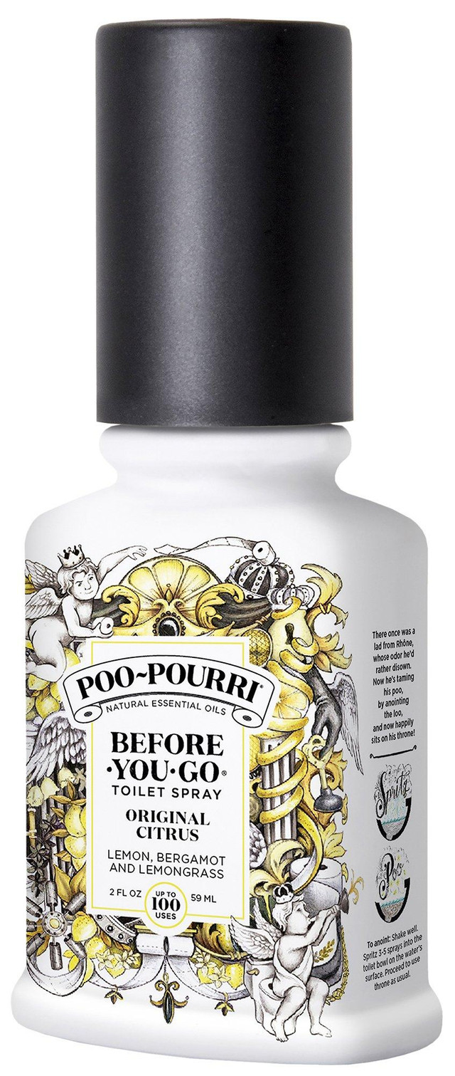 Poo-Pourri Before You Go toilet spray in a lemon, bergamot, and lemongrass scent. Spritz 3-5 sprays into the toilet bowl on the waters surface. All you'll smell is a refreshing bouquet of natural essential oils. 2 fl. oz. Up to 100 uses.