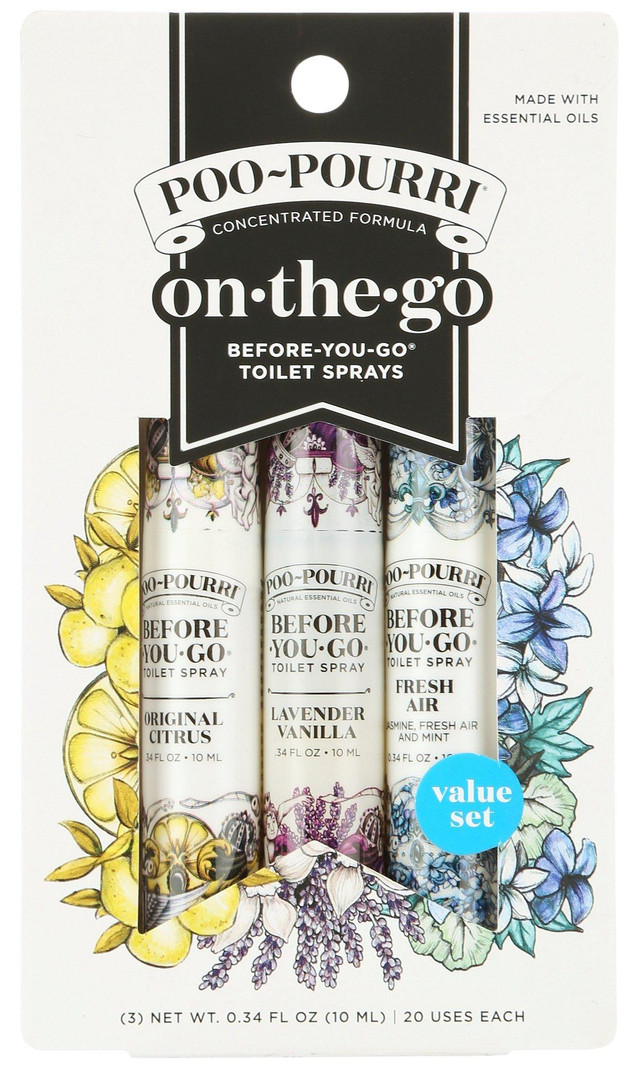 This 3-Pc. Before You Go Toilet Spray Travel Set features 3 assorted scent sprays for convenient Go On The Go. Spritz 3-5 sprays into the toilet bowl on the water surface. All you will smell is a refreshing bouquet of natural essential oils. Contains 3 x 0.34 fl.oz.