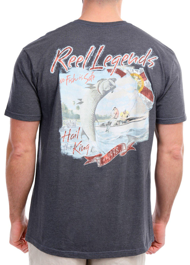 Rule the waters with the Men's Hail The King Fishing Graphic Tee. Featuring a bold and majestic fish graphic, this t-shirt is perfect for fishing enthusiasts who want to make a statement. Made from lightweight, breathable fabric, it ensures all-day comfort whether you're out on the boat or relaxing onshore. Its relaxed fit and eye-catching design make it a versatile addition to your casual wardrobe.