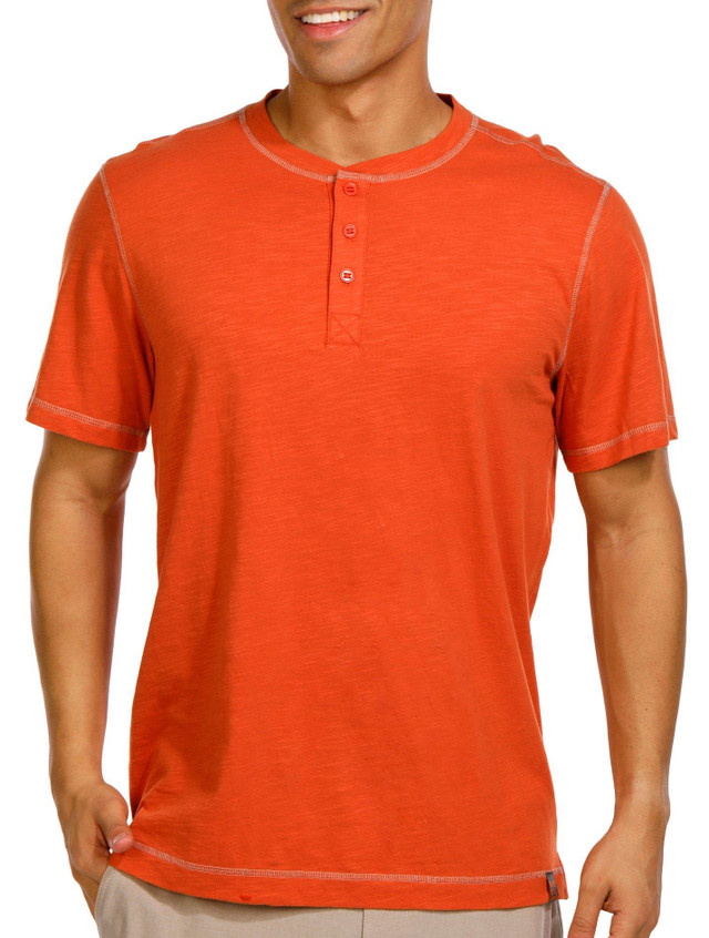 Introducing the Mens Short Sleeve Pineland Henley Tee by Reel Legends! Crafted from lightweight knit fabric, this tee features a solid color design and a classic three-button henley placket. The subtle brand logo tag adds authenticity. Perfect for casual outings and warm days in the sun! Measures approximately 30 inches in length. Fabrication 100% cotton.