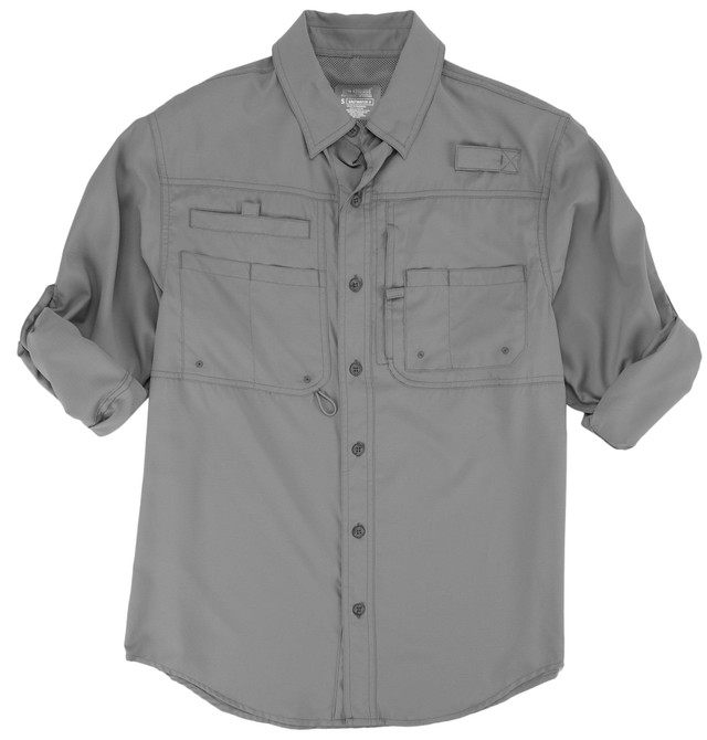 This Salt Water II long-sleeve shirt from Reel Legends features a solid color design on lightweight woven fabric, a point collar, button front closure, a fully vented back and underarm panel to keep you cool, two front utility chest pockets, a rod holder, UPF 50 sun protection, and moisture-wicking and quick-dry technology. Fabrication 100% polyester.