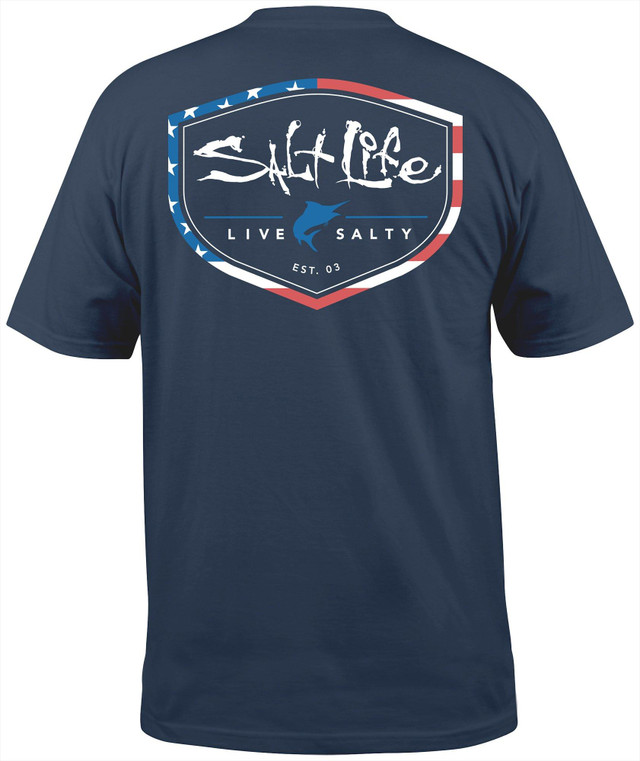 Salt Life designs apparel, footwear, and accessories with the ocean lover in mind. Display your love for fishing and brews on & off the water in this stylish short sleeve tee that's comfortable enough for all-day wear, featuring lightweight & breathable 100% cotton fabric, patriotic shield design on the back, Salt Life logo on the chest, single chest pocket, and flexible crew neckline.