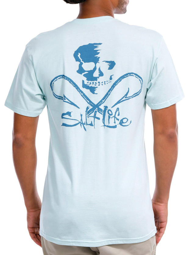 Embrace your adventurous spirit with the Men's Skull 'N Hooks T-Shirt. Made from 100% preshrunk cotton, this shirt features a graphic design on the chest slip pocket, short sleeves, and a comfortable crew neckline. The back showcases a striking skull and hooks graphic design, making it perfect for both casual wear and outdoor adventures.