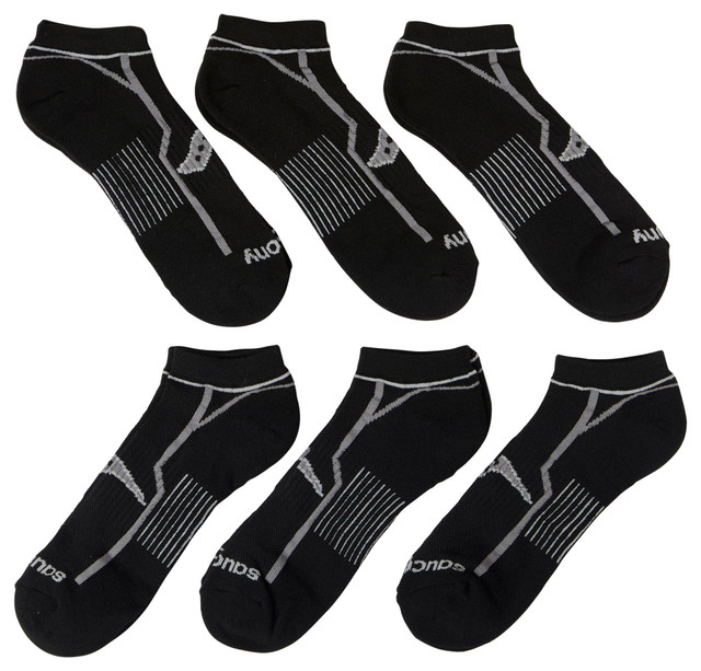 Performance Cushioned No Show Socks by Saucony feature a solid design, RunDry moisture management, arch support, mesh ventilation, and a cushioned sole. Package includes six pairs of socks. Fabrication is 95% polyester, 3% rubber, 2% spandex.