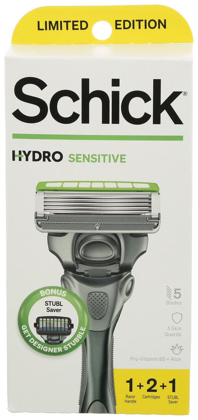 This Hydro Sensitive Value Pack contains one refillable razor, 2 cartridges with 5 blades each, and 1 stubble saver. Features cushioning gel pools with aloe and pro-vitamin B5, skin guards on every blade, a flip back trimmer, and shock absorbing technology.