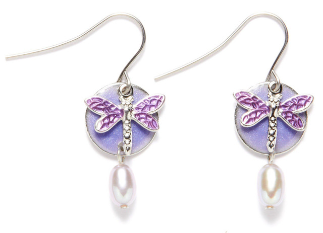 Complement your look with these Silver Forest earrings that feature silver tone fishhook backing, a purple dragonfly design on a round disc and pearlescent drop at the bottom.