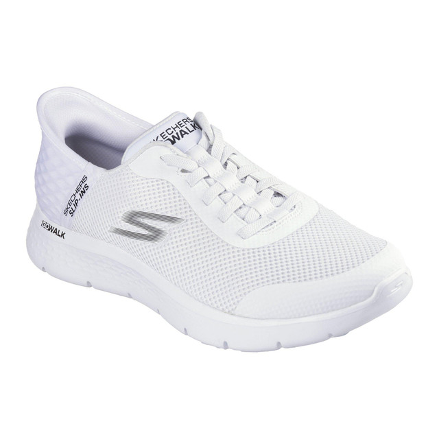 Step-in to convenient walking comfort and cushioning wearing Skechers Hands Free Slip-ins GO WALK Flex - Hands Up. This TOUCHLESS FIT design features a breathable athletic mesh upper with a Skechers Slip-ins molded heel panel, our exclusive Heel Pillow, Skechers Air-Cooled Memory Foam insole, lightweight ULTRA GO cushioning and Flex Pillars for added support.