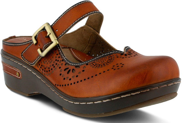 The L'Artiste Aneria open-back clogs features hand painted leather, floral laser cut design, contrast stitch detail, adjustable hook-and-loop strap with decorative buckle, and a padded insole.