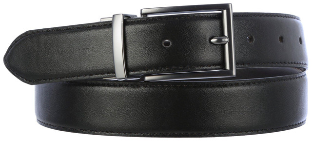 This Dress Belt features a solid color design on a smooth vegan leather fabrication, reversible capability by gently pulling the buckle and twisting, and a gloss-finish metal rectangular buckle. Measures approximately 30 mm wide.