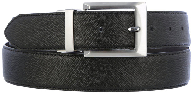 This Dress Belt features a solid color design on a textured vegan leather fabrication, reversible capability by gently pulling the buckle and twisting, and a gloss-finish metal rectangular buckle. Measures approximately 33 mm wide.
