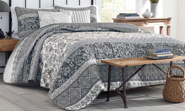 Wide bands of intricately detailed paisley and Jacobean floral patterns lend Provencal country flair to this soft and inviting quilt set. A classic palette of grey and white is perennially appealing and a diamond grid quilt stitch adds dimensional interest and additional comfort. Set includes quilt and two pillow shams (one for twin).