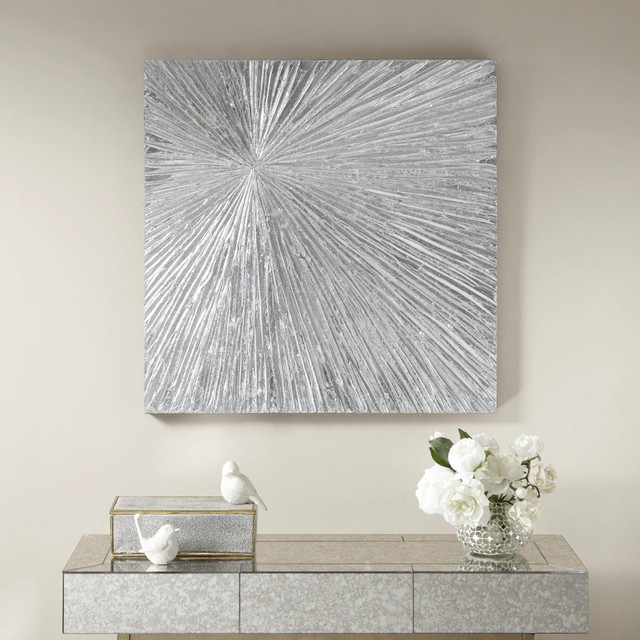 Accent your space with the contemporary allure of our Madison Park Sunburst Hand Painted Dimensional Resin Wall Art. 100% hand-painted, this canvas wall art showcases rich grey and silver sunburst design bold and contrasting abstract look. Resin embellishment creates beautiful texture and dimension. Art measures: 30W x 30H x 1.25D.