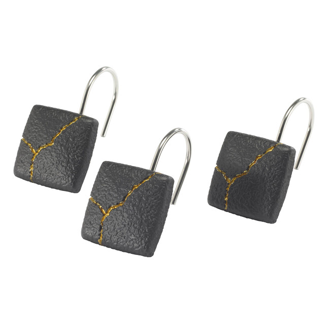 The Nicole Miller Sydney Collection Shower Hooks features a matte black textured body decorated with gold veins running throughout. Set of 12 hooks made of durable resin for easy care and long life. Perfect update for a contemporary bathroom. Coordinating shower curtain, rug, towel and other accessory pieces available. Shop the entire Sydney Bath Collection by Nicole Miller. Shower Hooks dimensions: 1.43 x 1.92 x 2.36.