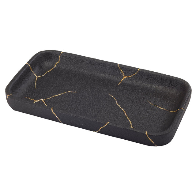 The Nicole Miller Sydney Collection Vanity Tray features a matte black textured body decorated with gold veins running throughout. Made of durable resin for easy care and long life. Perfect update for a contemporary bathroom. Coordinating shower curtain, rug, towel and other accessory pieces available. Shop the entire Sydney Bath Collection by Nicole Miller. Vanity Tray dimensions: 10.83 x 6.30 x 1.65.