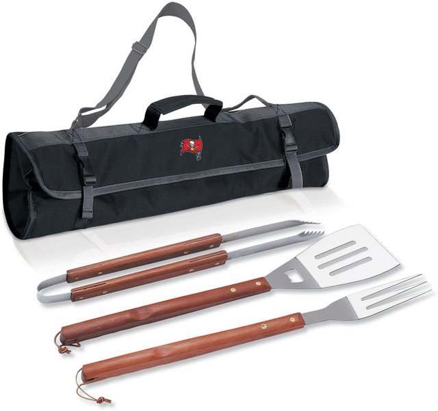 The 3 piece BBQ Tote set includes a spatula with built-in bottle opener, a pair of tongs, and a fork. The tools have extra long wooden handles and comes in a carry tote with an adjustable strap. Measures 22'' x 2'' x 5'' and weighs 4 lbs.