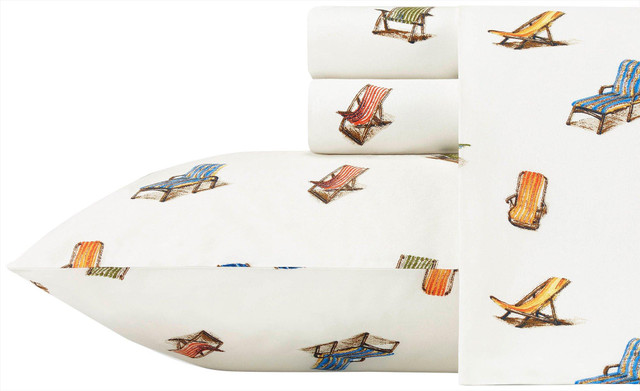 Beach chairs, pool chairs, deck chairs, and lounge chairs combine together in a lighthearted design that will make you smile as you drift off to sleep remembering lazy days in the sun. Sheets feature colorful cabana stripes on the individual chairs. These 100% percale cotton woven sheets are soft and comfortable with a 200 thread count. Set includes one flat sheet, one fully elasticized fitted sheet (fits up to 15 inch) , and two pillow cases (1 twin).
