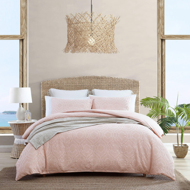 Transform your bedroom into a serene oasis with the Tommy Bahama basketweave comforter set. This comforter set features a unique and subtle basketweave woven design on a solid white ground. The reverse is a matching solid white ground on a cotton percale. The comforter is 100% cotton with an 8 oz. Polyester fill. Set includes 1 comforter and 2 shams