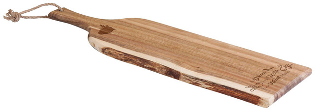 Serving plank with Cinderella design is a flat, paddle shaped serving plank with live bark edge and hemp hanging loop. Made of acacia wood. Measures: 24 in x 8 in x 8 in.