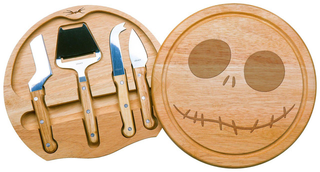 Circular cheese/cutting board comes with 4 full-tang stainless steel tools with wood handles (cheese cleaver, cheese planer, knife, and fork tipped knife). Made of rubberwood and measures 10.2 diameter x 1.6. Decoration features Jack design.
