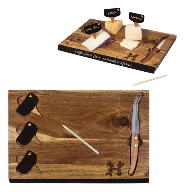 Cutting board and cheese tools set includes cutting board, one cheese knife, three cheese markers, and one soapstone pencil. Set features decoration of Disney Mickey & Minnie Mouse and cutouts to fit knife & cheese markers. Measures: 15 x 10 x .8 inches.