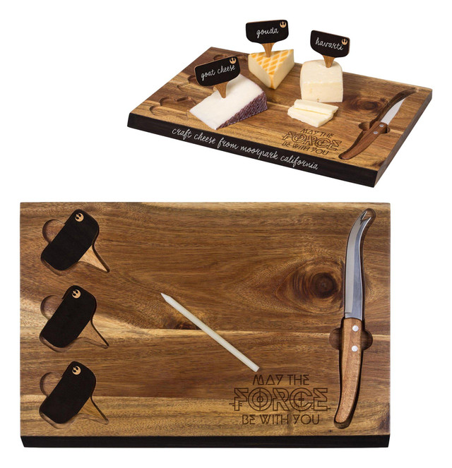 Cutting board and cheese tools set includes cutting board, one cheese knife, three cheese markers, and one soapstone pencil. Set features decoration of Star Wars Rebel Alliance and cutouts to fit knife & cheese markers. Measures: 15 x 10 x .8 inches.