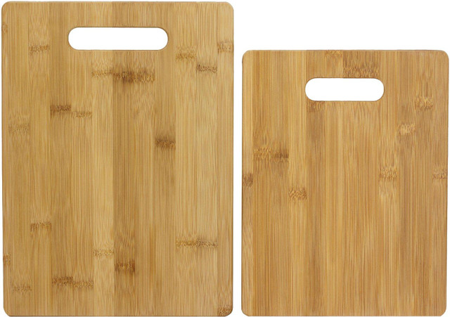 Totally Bamboo creates innovative and artistically designed kitchen accessories. This two-piece cutting board set features a durable bamboo construction and handle. Measures 11''L x 8.5''W and 13''L x 9.5''W.