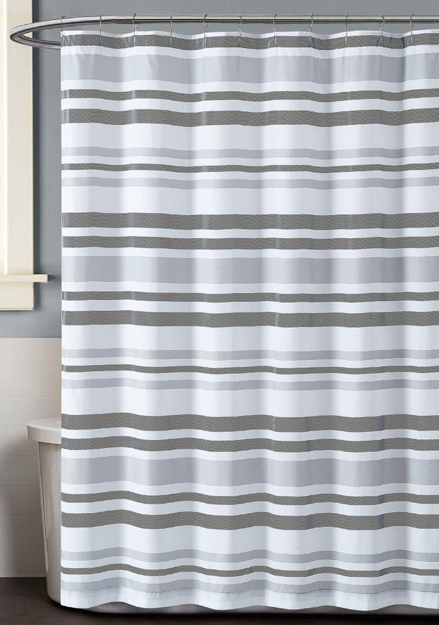 The pattern is dominated by gray shades on a white background. A simple and casual horizontal stripe is the focus for this shower curtain. Measures 72 x 72