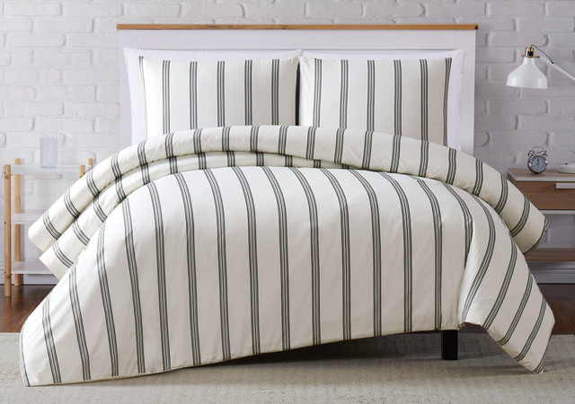 This easy to coordinate horizontal white stripe on a dyed background is a quick coordinate to a variety of rooms. The cloth uses a black print on a solid color base cloth. The base cloth is a 100% microfiber polyester fabric that is double brushed for a added softness. The set is completed with coordinating shams (one Sham for Twin).